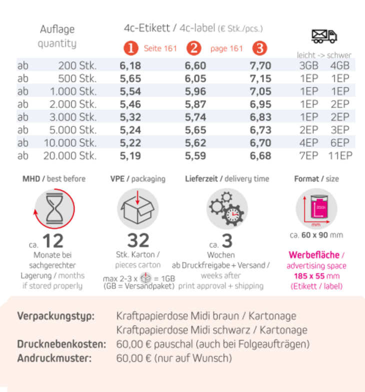 Inhalt: Gewürzmischung Verpackungstyp: Kraftpapierdose Midi braun / Kartonage (auf Nachfrage auch in Schwarz) Varianten:Preiskategorie 1135g Meersalz (Artikel-Nr.: 02561)135g Rosa Kristallsatz (Artikel-Nr.: 02562)90g Rosmarin-Salz (Artikel-Nr.: 02563)55g Chili-Satz (Artikel-Nr.: 02564)80g Bio Kräuter-Salz (Artikel-Nr.: 02565)Preiskategorie 275g Bio Alleskönner (Artikel-Nr.: 02566)75g Bio Feuer & Flamme (Artikel-Nr.: 02567)75g Rühreigewürz (Artikel-Nr.: 02568)75g African BBQ (Artikel-Nr.: 02569)65g Pfeffer geschrotet (Artikel-Nr.: 02570)50g BBQ Kräuter Rub (Artikel-Nr.: 02571)50g Tomate-Mozzarella (Artikel-Nr.: 02572)50g Mediterraner Veggi Mix (Artikel-Nr.: 02573)75g Steakgewürz (Artikel-Nr.: 02574)75g Steakpfeffer (Artikel-Nr.: 02575)25g Pizza-Kräuter (Artikel-Nr.: 02576)Preiskategorie 350g Bio Toskanische Bruschetta (Artikel-Nr.: 02577)130g Rauch-Salz (Artikel-Nr.: 02578)135g Black Lava Salz (Artikel-Nr.: 02579)110g Royal Curry (Artikel-Nr.: 02580)45g Kräuter-Steakgewürz (Artikel-Nr.: 02581)75g Orangen-Pfeffer (Artikel-Nr.: 02582)75g Zitronen-Pfeffer (Artikel-Nr.: 02583)50g HOT Karibik Mix (Artikel-Nr.: 02584)60g Fleur de Sel (Artikel-Nr.: 02585 )Format: ca. 60 x 90mmDruck: 4c-Etikett Digitaldruck - Bitte Standskizze anfordern!Werbefläche: 185 x 55 mmVerpackung: 32 Stück / KartonLieferzeit: ca. 3 Wochen ab Druckfreigabe + VersandHaltbarkeit: ca. 12 Monate bei sachgerechter Lagerung