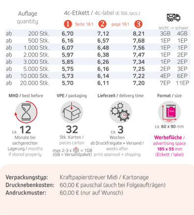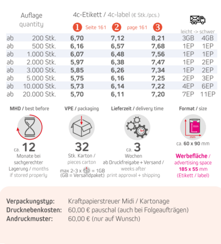Inhalt: Gewürzmischung im Eco Midi Pappstreuer mit eigenem LogoVarianten: Preiskategorie 1135g Meersalz (Artikel-Nr.: 01580)135g Rosa Kristallsatz (Artikel-Nr.: 01548)90g Rosmarin-Salz (Artikel-Nr.: 01550)55g Chili-Satz (Artikel-Nr.: 01552)80g Bio Kräuter-Salz (Artikel-Nr.: 01549)Preiskategorie 275g Bio Alleskönner (Artikel-Nr.: 01559)75g Bio Feuer & Flamme (Artikel-Nr.: 01560)75g Rühreigewürz (Artikel-Nr.: 01634)75g African BBQ (Artikel-Nr.: 01553)65g Pfeffer geschrotet (Artikel-Nr.: 01588)50g BBQ Kräuter Rub (Artikel-Nr.: 01554)50g Tomate-Mozzarella (Artikel-Nr.: 01555)50g Mediterraner Veggi Mix (Artikel-Nr.: 01610)75g Steakgewürz (Artikel-Nr.: 01557)75g Steakpfeffer (Artikel-Nr.: 01558)25g Pizza-Kräuter (Artikel-Nr.: 01565)Preiskategorie 350g Bio Toskanische Bruschetta (Artikel-Nr.: 01626)130g Rauch-Salz (Artikel-Nr.: 01602)135g Black Lava Salz (Artikel-Nr.: 01561)110g Royal Curry (Artikel-Nr.: 01860)45g Kräuter-Steakgewürz (Artikel-Nr.: 01563)75g Orangen-Pfeffer (Artikel-Nr.: 01564)75g Zitronen-Pfeffer (Artikel-Nr.: 01566)50g HOT Karibik Mix (Artikel-Nr.: 01618)65g Fleur de Sel (Artikel-Nr.: 01567)Format: ca. 60 x 90mmDruck: 4c-Etikett Digitaldruck - Bitte Standskizze anfordern!Werbefläche: 185 x 55 mmVerpackung: 32 Stück / KartonLieferzeit: ca. 3 Wochen ab Druckfreigabe + VersandHaltbarkeit: ca. 12 Monate bei sachgerechter Lagerung