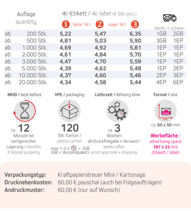 Inhalt: Gewürzmischung Verpackungstyp: Kraftpapier Streuer Mini / KartonageVarianten: Preiskategorie 175g Meersalz (Artikel-Nr.: 01882)75g Rosa Kristallsatz (Artikel-Nr.: 01862)52g Rosmarin-Salz (Artikel-Nr.: 01864)30g Chili-Satz (Artikel-Nr.: 01866)40g Bio Kräuter-Salz (Artikel-Nr.: 01863)Preiskategorie 240g Bio Alleskönner (Artikel-Nr.: 01873)40g Bio Feuer & Flamme (Artikel-Nr.: 01874)40g Rühreigewürz (Artikel-Nr.: 01888)40g African BBQ (Artikel-Nr.: 01867)38g Pfeffer geschrotet (Artikel-Nr.: 01883)28g BBQ Kräuter Rub (Artikel-Nr.: 01868)28g Tomate-Mozzarella (Artikel-Nr.: 01869)28g Mediterraner Veggi Mix (Artikel-Nr.: 01885)40g Steakgewürz (Artikel-Nr.: 01871)40g Steakpfeffer (Artikel-Nr.: 01872)10g Pizza-Kräuter (Artikel-Nr.: 01879)Preiskategorie 328g Bio Toskanische Bruschetta (Artikel-Nr.: 01887)75g Rauch-Salz (Artikel-Nr.: 01884)75g Black Lava Salz (Artikel-Nr.: 01850)50g Royal Curry (Artikel-Nr.: 01861)25g Kräuter-Steakgewürz (Artikel-Nr.: 01877)40g Orangen-Pfeffer (Artikel-Nr.: 01878)40g Zitronen-Pfeffer (Artikel-Nr.: 01880)28g HOT Karibik Mix (Artikel-Nr.: 01886)40g Fleur de Sel (Artikel-Nr.: 01852)Haltbarkeit: ca. 12 Monate bei sachgerechter LagerungFormat: ca. 60 x 50 mm Druck: 4c-Etikett Digitaldruck - Bitte Standskizze anfordern! Werbefläche: 187 x 22 mmVerpackung: 120 Stück / KartonLieferzeit: ca. 3 Wochen ab Druckfreigabe + Versand