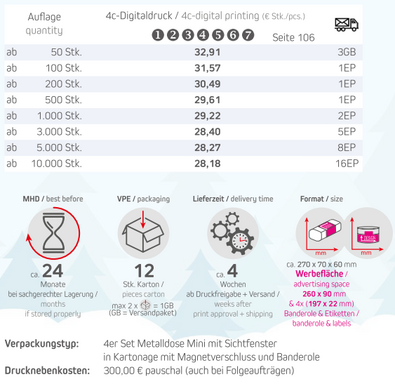 Werbefläche: 260x90 + 4x(197x22) x mm, Werbeanbringung als Direktdruck in 4c individuell bedruckbar.Verpackung: Geschenk-Set Premium rot mit Magnetverschluss und 4 Metalldosen Mini mit Sichtfenste aus PapierFormat: 270x70x60 mmMindesthaltbarkeit: 24 MonateLieferzeit: 4 Wochen ab DruckfreigabeZutaten Verschiedene Weihnachts Gewürzmischungen: je nach Weihnachts Gewürzmischung