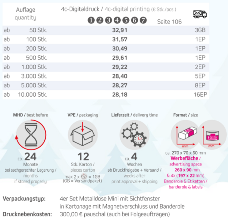 Werbefläche: 260x90 + 4x(197x22) x mm, Werbeanbringung als Direktdruck in 4c individuell bedruckbar.Verpackung: Geschenk-Set Premium schwarz mit Magnetverschluss und 4 Metalldosen Mini mit Sichtfenster aus PapierFormat: 270x70x60 mmLieferzeit: 4 Wochen ab DruckfreigabeMindesthaltbarkeit: 24 MonateZutaten Verschiedene Weihnachts Gewürzmischungen: je nach Weihnachts Gewürzmischung