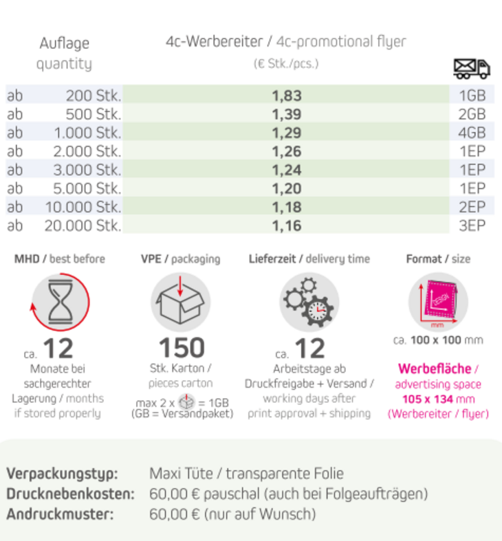 Produkt: Maxi Tüte / transparente FolieInhalt: Vegane Bio Gummibärchen ohne Gelatine 30gFormat: ca. 100 x 100 mmDruckart: DigitaldruckWerbefläche: 4c-Werbereiter 105 x 134 mm Lieferzeit: ca. 12 Arbeitstage ab Druckfreigabe + VersandVPE: 150 Stk. / KartonHaltbarkeit: ca. 12 Monate bei sachgerechter LagerungMindestbestellmenge: 200 Stück