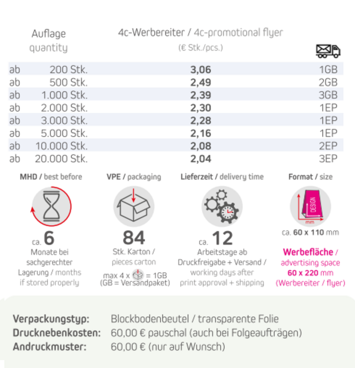 Produkt: Blockbodenbeutel mit WerbereiterInhalt: 40g Gummibärchen zuckerfreiFormat: ca. 60 x 110 mmDruckart: DigitaldruckWerbefläche: 4c-Werbereiter 60 x 220 mm Lieferzeit: ca. 12 Arbeitstage ab Druckfreigabe + VersandVPE: 84 Stk. / KartonHaltbarkeit: ca. 6 Monate bei sachgerechter LagerungMindestbestellmenge: 200 Stück