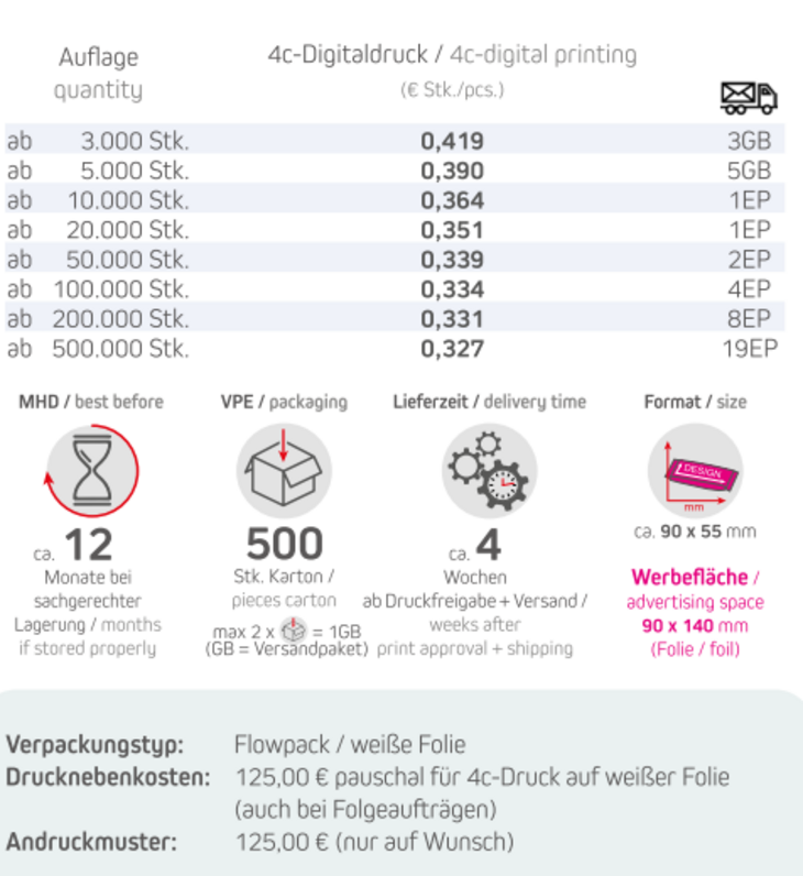 Verpackungstyp: Flowpack / weiße FolieInhalt: Butter Herzen Keks 7g Format: ca. 99 x 55 mmDruckart: 4c-DigitaldruckWerbefläche: 90 x 140 mm Lieferzeit: ca.4 Wochen ab Druckfreigabe + VersandVPE: 500 Stk. / pro KartonHaltbarkeit: ca. 12 Monate bei sachgerechter LagerungMindestmenge: 3000 Stk.Hinweis: Die Kekse können beim Versand brechen, das ist kein Reklamationsgrund!