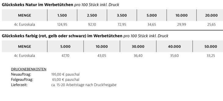 Preisliste Glückskeks mit Werbung und Logo