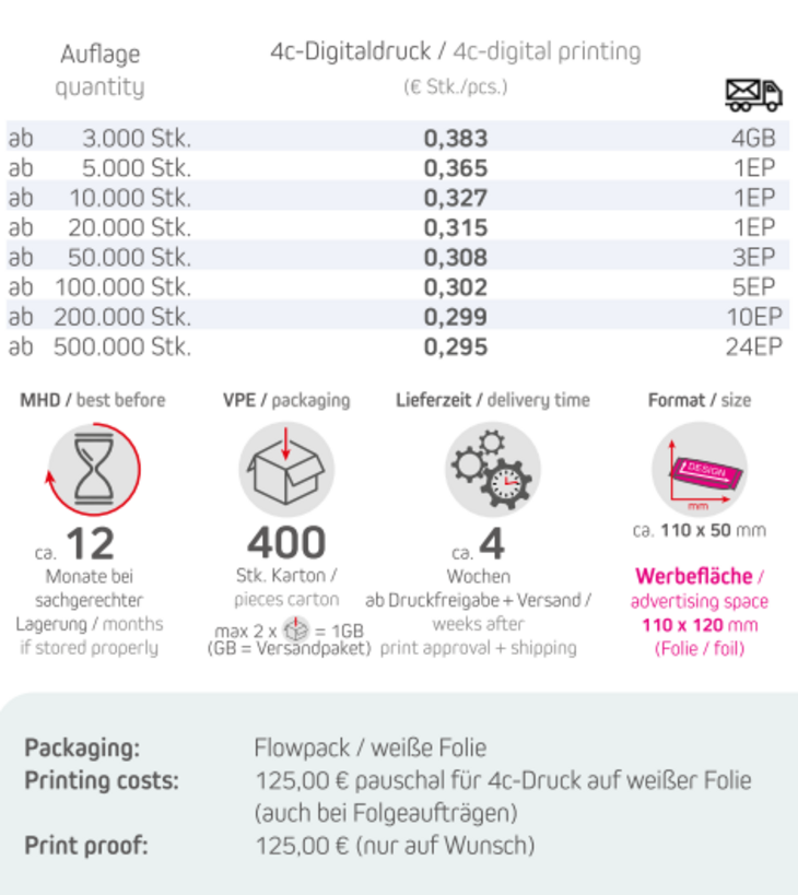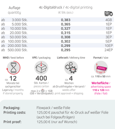 Produkt: Flowpack / weiße FolieInhalt: Karamellkeks (Lotus) 8gFormat: ca. 110 x 50 mmDruck: 4c-DigitaldruckWerbefläche: 110 x 120 mmLieferzeit: ca. 4 Wochen ab Druckfreigabe + VersandVPE: 400 Stk. / KartonHaltbarkeit: ca. 12 Monate bei sachgerechter LagerungMindestbestellmenge: 3000 Stück Hinweis: Die Kekse können beim Versand brechen, das ist kein Reklamationsgrund!