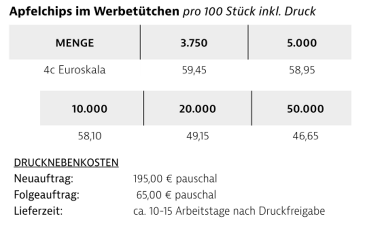 Preisliste Apfelchips in Werbetüte mit Logo