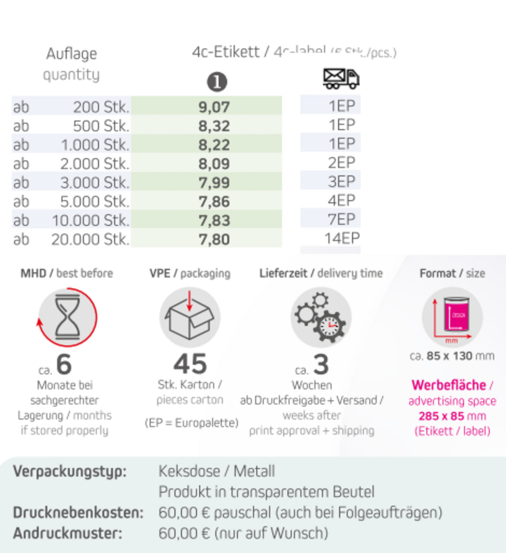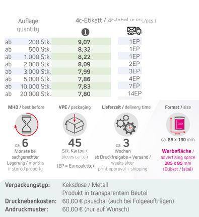 Produkt: Metalldose MaxiInhalt: Bio Cookie Schoko-Orange 100gFormat: ca. 85 x 130 mmWerbefläche: 4c-Etikett 285 x 85 mm Lieferzeit: ca. 3 Wochen ab Druckfreigabe + VersandVPE: 45 Stk. / KartonHaltbarkeit: ca. 6 Monate bei sachgerechter LagerungMindestbestellmenge: 200 Stück