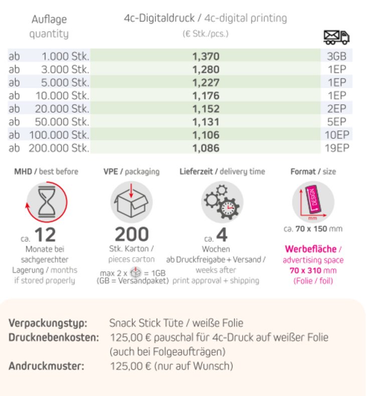 Verpackungstyp: Stick-Tüte / weißer FolieInhalt: Bio Knusperkugel-Mix 20gFormat: ca. 70 x 150 mmDruck: 4c-DigitaldruckWerbefläche: 70 x 310 mmVerpackung: 200 Stück / KartonLieferzeit: ca. 4 Wochen ab Druckfreigabe + VersandHaltbarkeit: ca. 12 Monate bei sachgerechter LagerungMindestmenge: 1000 Stk.
