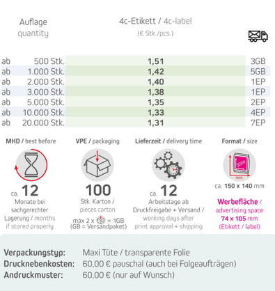 Verpackungstyp: Maxi Tüte / transparente FolieProdukt: Bio Mini Brezeln 30gFormat: ca. 150 x 140 mmWerbefläche: 4c-Etikett 74 x 105 mm Lieferzeit: ca. 12 Arbeitstage ab Druckfreigabe + VersandVPE: 100 Stk. / KartonHaltbarkeit: ca. 12 Monate bei sachgerechter Lagerung oder ca. 3 Monate bei sachgerechter Lagerung in Bio-FolieMindestbestellmenge: 500 Stck.