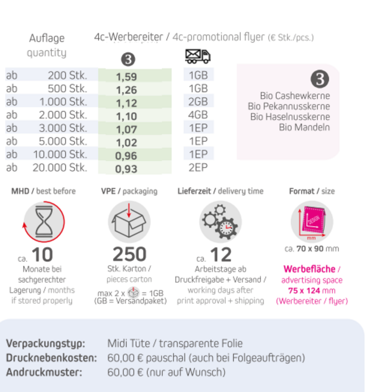 Produkt: Midi Tüte / transparente FolieInhalt: Vegane Bio Nusskernmischung 15gFormat: ca. 70 x 90 mmDruck: 4c-WerbereiterWerbefläche: 75 x 124 mm + 3 mm Beschnitt rundumLieferzeit: ca. 12 Arbeitstage ab Druckfreigabe + VersandVPE: 250 Stk. / KartonHaltbarkeit: ca. 10 Monate bei sachgerechter LagerungMindestbestellmenge: 200 Stück Zutaten Bio NusskernMix: Nusskernmischung* (in veränderlichen Gewichtsanteilen: HASELNUSSkerne*, MANDELN blanchiert*, MANDELN*, CASHEWkerne*, PEKANNUSSkerne*); *aus kontrolliert biologischem Anbau. Produkt unterliegt naturgegebenen Schwankungen - trotz strenger Kontrolle können Schalen-/Kernbestandteile nicht ausgeschlossen werden. Kann Spuren von anderen Schalenfrüchten (Nüssen) und Getreide enthalten