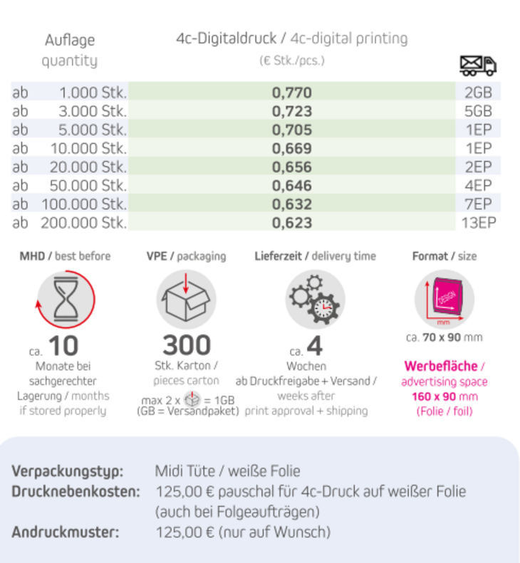 Verpackungstyp: Midi Tüte / weiße FolieInhalt: ca. 15g Bio-StudentenfutterMindestmenge: 1.000 StückVerpackungseinheit: 300 StückFormat: Midi-Tüte B 70 x H 90 mmDruck: 4c-DigitaldruckWerbefläche: 160 x 90 mm Lieferzeit: ca. 4 Wochen ab DruckfreigabeHaltbarkeit: ca. 10 Monate bei sachgerechter Lagerung