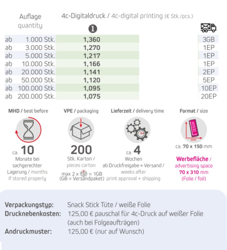 Inhalt: 30 g Bio Studentenfutter oder Premium StudentenfutterMindestmenge: 1000 Stk.Haltbarkeit: ca. 10 Monate bei sachgerechter LagerungNetto-Gewicht: ca. 30 gVerpackungstyp: Snack Stick-Tüte / weiße Folie Format: ca. 70 x 150 mmDruckart: 4c-Digitaldruck Werbefläche: 70 x 310 mmVerpackung: 200 Stück / KartonLieferzeit: ca. 4 Wochen ab Druckfreigabe + VersandZutaten Bio Studentenfutter: Nusskernmischung* 60% (in veränderlichen Gewichtsanteilen: Haselnusskerne*, Mandeln blanchiert*, Mandeln*, Cashewkerne*, Pekannusskerne*), Rosinen* 40%; * aus kontr. biologischem Anbau. Kann Spuren von anderen Schalenfrüchten und Getreide enthalten. Produkt unterliegt naturgegebenen Schwankungen - trotz strenger Qualitätskontrolle können Schalen-bzw. Kernbestandteile nicht ausgeschlossen werden.