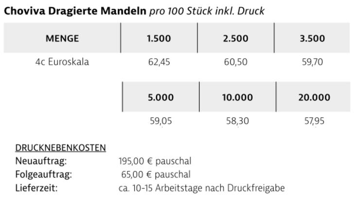 Preisliste ChoViva Dragierte Mandeln im Werbetütchen mit Logo Details