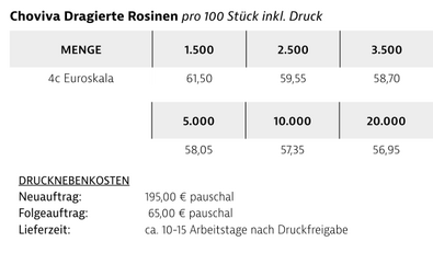 Preisliste ChoViva Dragierte Rosinen im Werbetütchen mit Logo Details