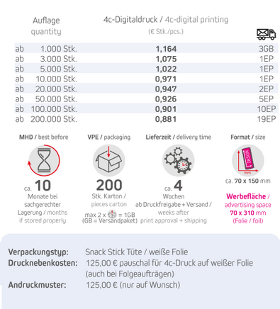 Verpackungstyp: Snack Stick tüte / weiße FolieInhalt: 10 g Erdnüsse in den Sorten: Barbecue (Artl-Nr. MF-NB-01203), Wasabi (Art.-Nr. MF-NB-01204), Paprika (Art.-Nr. MF-NB-001205), (Chili Art.-Nr. 01992)Netto-Gewicht: ca. 20 gFormat: ca. 70 x 150 mmDruckart: 4c-DigitaldruckWerbefläche: 70 x 310 mmMindestmenge: 1000 Stk.Haltbarkeit: ca. 10 Monate bei sachgerechter LagerungVerpackung: 200 Stück / KartonLieferzeit:: ca. 4 Wochen ab Druckfreigabe + Versand