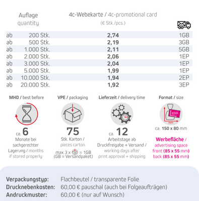 Produkt: Flachbeutel / transparente FolieInhalt: 25g Erdnüsse in verschiedene Sorten:Barbecue (MF-NB-00049), Wasabi (MF-NB-00050), Paprika (MF-NB-00051), Chili (Art.-Nr.MF-NB- 01989)Format: ca. 150 x 80 mmDruck: 4c-WerbekarteWerbefläche: 85 x 55 mm + 3 mm Beschnitt rundumLieferzeit: ca. 12 Arbeitstage ab Druckfreigabe + VersandVPE: 75 Stk. / KartonHaltbarkeit: ca. 6 Monate bei sachgerechter LagerungMindestbestellmenge: 200 Stück