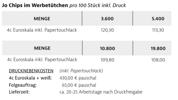 Kross und lecker, vom Feld in die Tüte. Die würzigen Jo Chips sind hochwertige Chips die direkt vom Landwirt produziert werden. Verpackt werden die Jo Chips im klassischen Werbetütchen mit individueller Veredelung.Gewicht: Inhalt 20 gSorten: - Paprika oder SalzVerpackungsmaß: ca. 145 x 190 mmVerpackungseinheit: 60 St. im Karton / 1.800 St. pro PaletteHaltbarkeit: Paprika: ca. 9 Monate bei sachgerechter Lagerung und Salz: ca. 7 Monate bei sachgerechter LagerungLieferzeit: ca. 20-25 Arbeitstage nach DruckfreigabeMindestbestellmenge: 3600 Stück