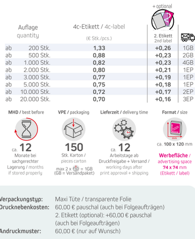 Produkt: Maxi Tüte / transparente FolieInhalt: Kräcker Mix 12gFormat: ca. 100 x 120 mmWerbefläche: 4c-Etikett 74 x 74 mm Optional: 2. Etikett möglich!Lieferzeit: ca.12 Arbeitstage ab Druckfreigabe + VersandVPE: 150 Stk. / KartonHaltbarkeit: ca. 12 Monate bei sachgerechter LagerungMindestbestellmenge: 200 Stück