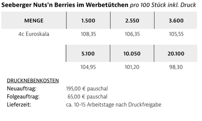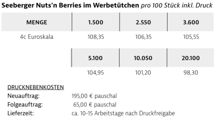 Preisliste Nuts'n Berries im Werbetütchen mit Logo
