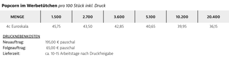 Leckeres, süßes Popcorn verpackt im individuell bedruckten WerbetütchenGewicht: Inhalt ca. 10 g, GVO freiVerpackungsmaß: ca. 110 x 150 mmVerpackungseinheit: 300 Stück im Polybeutel / 5.100 St. im PalettenkartonHaltbarkeit: ca. 3 Monate bei sachgerechter LagerungLieferzeit: ca. 10-15 Arbeitstage nach DruckfreigabeMindestbestellmenge: 1.500 Stück