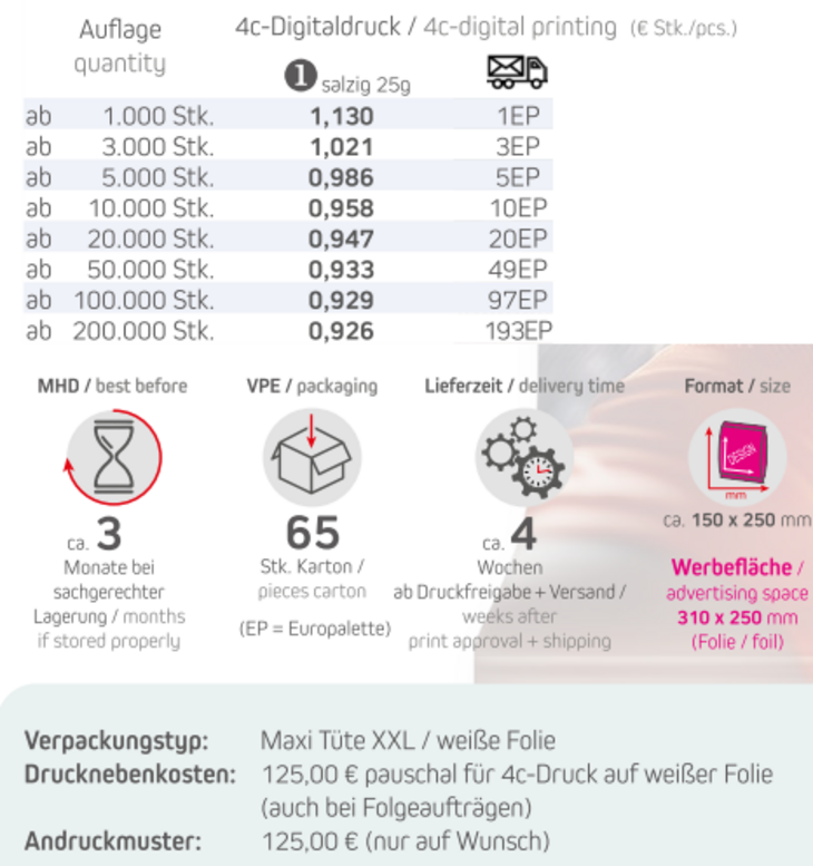 Verpackungstyp: Maxi Tüte XXL / weiße FolieInhalt: 25g salziges PopcornFormat: ca. 150 x 250 mmDruck: 4c-Digitaldruck auf TütchenWerbefläche: 310 x 250 mmLieferzeit: ca. 4 Wochen ab Druckfreigabe + VersandVerpackung: 65 Stück / KartonHaltbarkeit: ca. 3 Monate bei sachgerechter LagerungMindestbestellmenge: 1.000 Stück