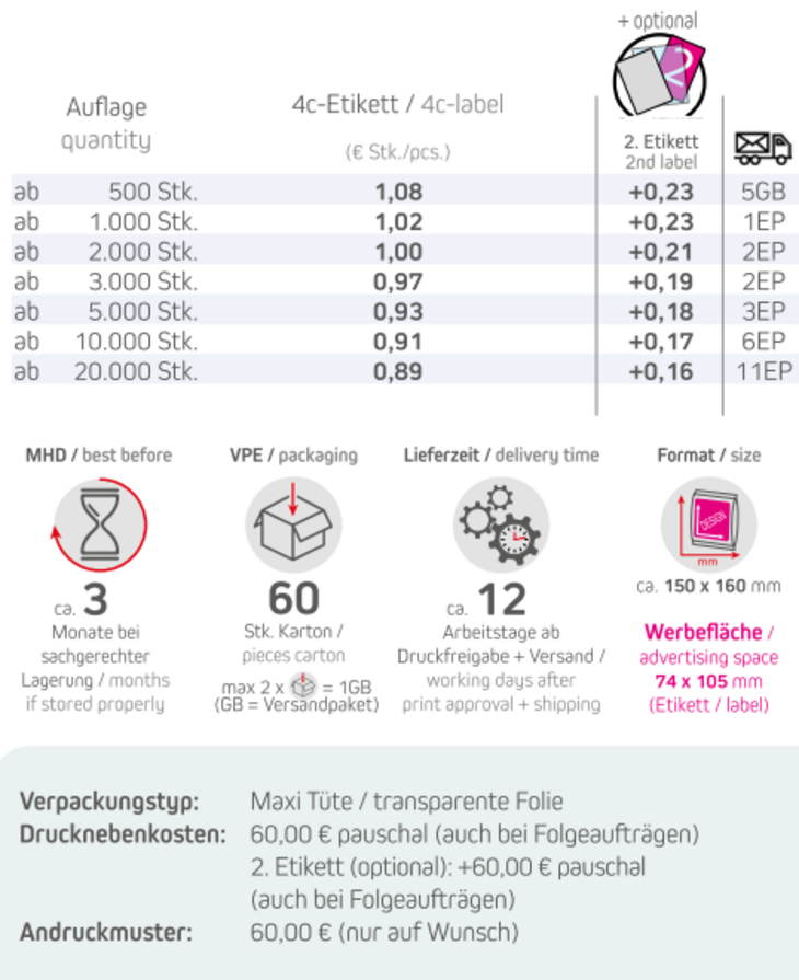 Produkt: Maxi Tüte / transparente FolieInhalt: Süßes Popcorn 20gFormat: ca. 150 x 160 mmWerbefläche: 4c-Etikett 74 x 105 mm Optional: 2. Etikett möglichLieferzeit: ca.12 Arbeitstage ab Druckfreigabe + VersandVPE: 60 Stk. / KartonHaltbarkeit: ca. 3 Monate bei sachgerechter LagerungMindestbestellmenge: 500 Stück