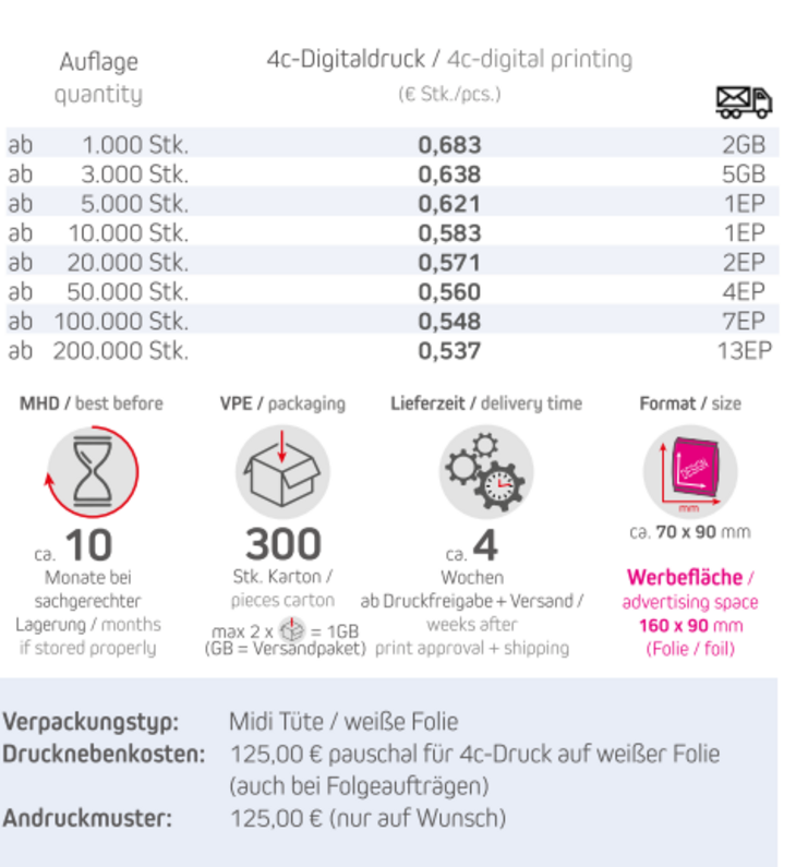Produkt: Maxi Tüte / weiße oder transparente FolieInhalt: 15 g Premium StudentenfutterFormat: ca. 70 x 90 mmDruckart: 4c-DigitaldruckWerbefläche: 160 mm x 90 mmLieferzeit: ca. 4Wochen ab Druckfreigabe + VersandVPE: 200 Stk. / KartonHaltbarkeit: ca. 10 Monate bei sachgerechter LagerungMindestbestellmenge: 1000 Stück