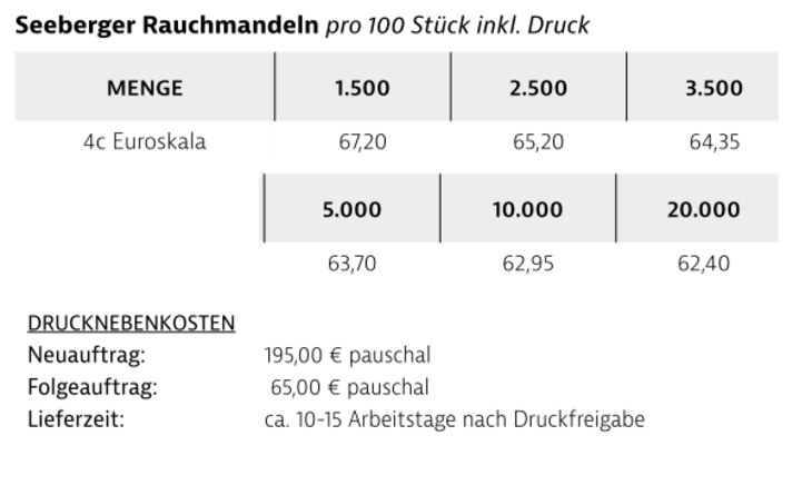 Preisliste Rauchmandeln im Werbetütchen mit Logo