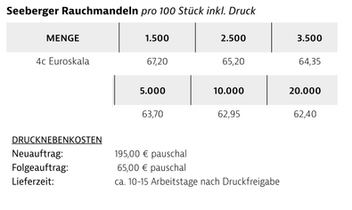 Seeberger Rauchmandeln sind hochwertige kalifornische Mandeln, schonend geröstet und veredelt. Verpackt im individuell bedruckten Werbetütchen.Gewicht: Inhalt ca. 10 gVerpackungsmaß: ca. 60 x 100 mmVerpackungseinheit: 250 Stück im Karton / 1.000 St. im UmkartonHaltbarkeit: ca. 9 Monate bei sachgerechter LagerungLieferzeit: ca. 10-15 Arbeitstage nach DruckfreigabeMindestbestellmenge: 1.500 Stück