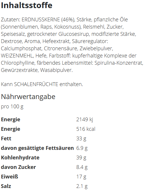 Für alle, die es scharf mögen: Geröstete Erdnüsse in einer knusprigen Teighülle mit würzigem Wasabi-Geschmack. Diese pikanten Snacks sorgen für den extra Kick und sind perfekt für Liebhaber von feurigen Aromen.Inhalt: ca. 15 gGeschmack: Meerrettich, scharfFormat: 80 x 100 mmFolie: weiße FolieDruck: 4c EuroskalaVerpackungseinheit: 175 TütchenHaltbarkeit: ca. 4 Monate bei sachgerechter LagerungLieferzeit: ca. 15 Arbeitstage nach DruckfreigabeMindestbestellmenge: 3.000 StückDatenbearbeitung: Erstellung oder Überarbeitung (falls Vorlage nicht 1:1 gestellt wird) wird nach Aufwand berechnet