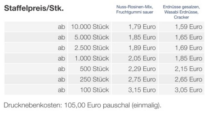 Kleine Dose, großer Genuss! Ob süß, salzig oder scharf – die individuell bedruckbare Werbe-Snack-Dose bietet für jeden Geschmack dasPassende. Wählen Sie aus fünf beliebten Füllungen: Würzige Cracker, knackige Erdnüsse, scharfe WasabiNüsse, saure Fruchtgummis oder klassisches Studentenfutter. Ein abwechslungsreiches Präsent, das Kunden und Mitarbeiter gleichermaßen begeistert – ideal für Events, Messen oder als genussvolle Aufmerksamkeit im BüroProduktdetails: Snack-Dose mit einer individuell bedruckbaren WerbebanderoleBedruckung: 4-farbiger Druck auf grafischem Premium-Karton (FSC ® -zertifiziert). Optional auf Graspapier, Naturkarton oder Coffee-Cup-PaperVerpackung: 72 Stück pro Karton, 3.888 Stück pro PaletteFormat: ca. 179 x 60 x 50 mmInhalt: 6er Nuss-Rosinen-Mix (Studentenfutter) 50g oder Cracker mit Käse 20g oder Erdnüsse gesalzen 60g oder Wasabi-Erdnüsse 40g oder Fruchtgummi-Mischung, sauer 60g Wichtig: Bitte Füllwunsch bei der Bestellung mit angeben !Haltbarkeit: 12 Monate. Lieferzeit/Zubehör: ca.15 Arbeitstage nach Druckfreigabe.Mindestbestellmenge: 100 Stück