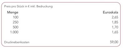Preisliste Würfel mit Lakritzstäbchen mit Logo