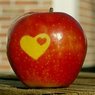 - Später werden dann die Herzschablonen vorsichtig von Hand entfernt. Und nun wird es sichtbar: Dort wo kein Licht an die Apfelschale gelangt, entsteht keine Farbe (Bikinieffekt).