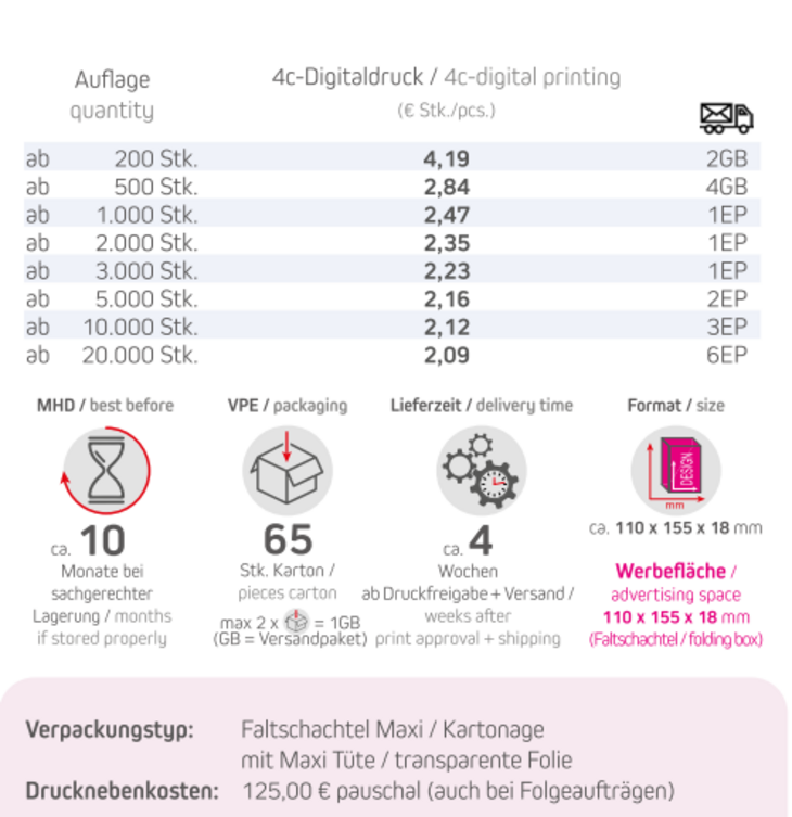Verpackungstyp: Faltschachtel Maxi / KartonageInhalt: Müsli Apfel-CranberryFormat: ca. 110 x 155 x 18 mmDruckart: 4c-DigitaldruckWerbefläche: 110 x 155 x 18 mmVerpackung: 65 Stück / KartonLieferzeit: ca. 4 Wochen ab Druckfreigabe + VersandMindestmenge: 200 Stk.Haltbarkeit: ca. 10 Monate bei sachgerechter Lagerung