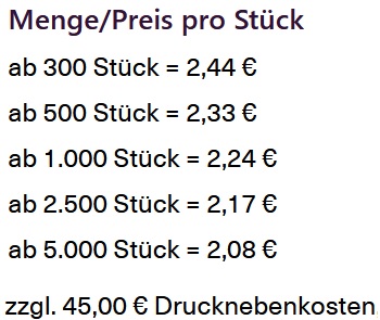 Schnell und kostengünstig zu realisieren, einfach im Handling und doch überaus geschmackvoll in der Präsentation. Das beschreibt die wesentlichen Vorzüge des Mini-Bodenbeutels mit leckerer Müsli-Füllung in aller Kürze. Speziell für kurzfristige Aktionen oder auch aktionsbezogen wechselnde Individualisierung bietet er sich besonders an, da er bereits ab 300 Stück mit einem individuell bedruckten Faltetikett verfügbar ist. Die köstliche Müsli-Füllung sorgt dafür, dass beim Empfänger auch der Genuss für einen bleibenden Eindruck sorgt.Maße Etikett: 95 x 90 mm je SeiteVerpackungsmaß: 90 x 70 x 125 mmGewicht: ca. 125 gFüllmenge: ca. 120 gHaltbarkeit: mind. 28 WochenGeschmacksrichtungen: Schoko-Müsli oder Früchte-MüsliMindestbestellmenge: 300 Stück