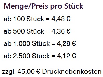 Die mit köstlichem Müsli gefüllte Aromadose aus Metall mit Zippverschluss und zusätzlichem Aromadeckel begeistert Sekretariate, kleine Teams, aber auch große Entscheider. Die vierfarbig bedruckbare Papierbanderole bietet mit einer Gesamtfläche von 319 x 113 mm viel Raum für die kreative Gestaltung, mit der die Aromadose zu einem wahren Eyecatcher wird. Die Füllmenge von ca. 350 g unserer Müslimischungen für Genießer ist ein sicherer Garant für Mehrfachkontakte mit Genuss für alle Sinne.Verpackungsmaß: 104 mm D x 120 mmMaße Banderole: 319 x 108 mmMaße Dose: 104 mm x 120 mmGewicht: ca. 460 gFüllmenge: ca. 350 gHaltbarkeit: mind. 28 WochenGeschmacksrichtungen: Schoko-Müsli, 5-Früchte-MüsliIndividualisierung: inkl. 4C-Digitaldruck auf PapierbanderoleMindestbestellmenge: 100 Stück