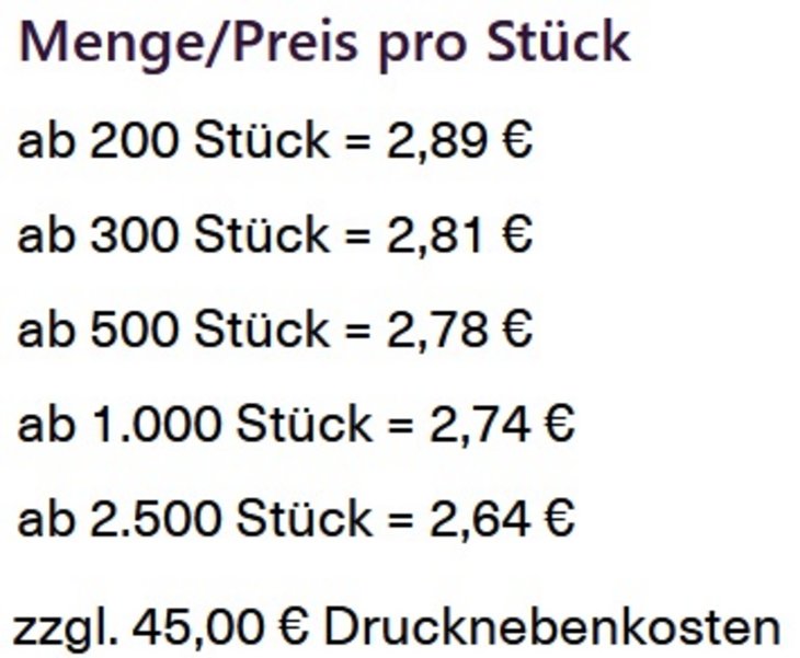 Individualisieren Sie den Bodenbeutel mit einer Abbildung Ihres Logos, Ihrer Botschaft u.v.m. auf einem Faltetikett. Die Kombination aus bedrucktem Faltetikett (Digitaldruck) und dem transparenten Beutel eignet sich besonders gut für Aktionen mit mehrfachen Motivwechseln.Maße Etikett: 130 x 90 mm je SeiteVerpackungsmaß: 90 x 70 x 180 mmGewicht: ca. 260 gFüllmenge: ca. 250 gHaltbarkeit: mind. 28 WochenGeschmacksrichtungen: Classic-Müsli, Schoko-Müsli oder 5-Früchte-MüsliMindestbestellmenge: 200 Stück