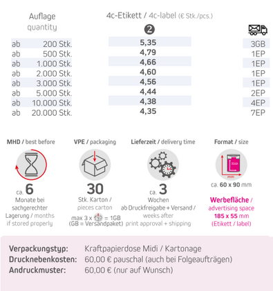 Produkt: Biologisch abbaubare Eco Pappdose MidiVerpackungstyp: Kraftpapierdose midi / Kartonage braunInhalt: Müsli Knusper Banane-Schoko 70g Format: ca. 60 x 90 mmDruck: 4c-DigitaldruckWerbefläche: Etikett 185 x 55 mm (gemäß Standskizze)Haltbarkeit: ca. 6 Monate bei sachgerechter LagerungVerpackung: 30 Stück / KartonLieferzeit: ca. 4 Wochen ab DruckfreigabeMindestbestellmenge: 200 Stck.