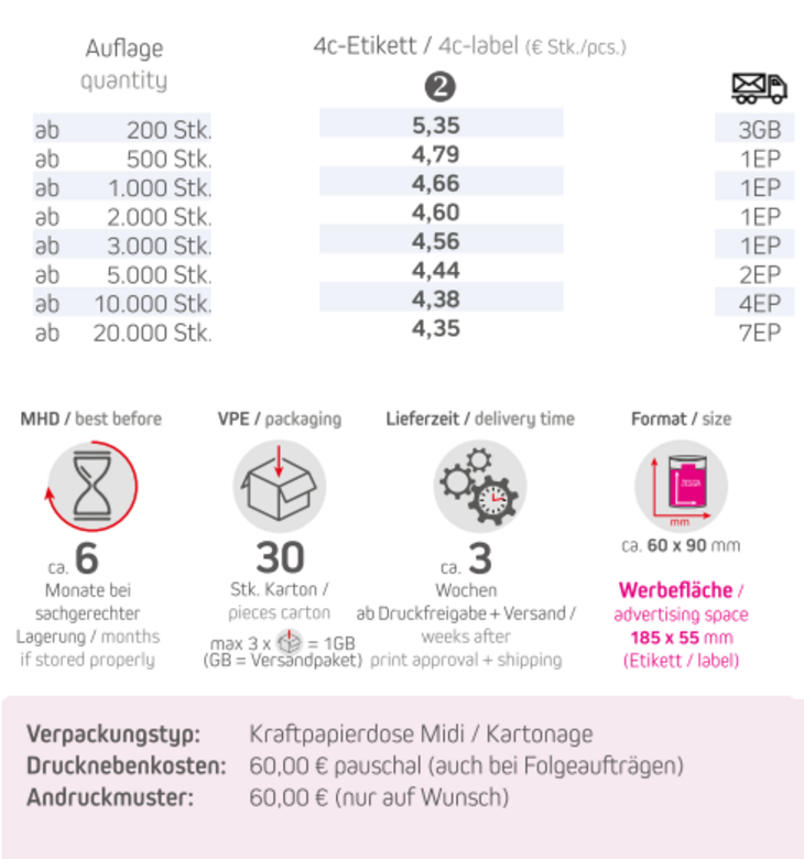 Inhalt: Müsli Knusper Früchte 70gVerpackungstyp: Kraftpapierdose midi / Kartonage schwarzFormat: ca. 60 x 90 mmDruck: 4c-DigitaldruckWerbefläche: Etikett 185 x 55 mm (gemäß Standskizze)Haltbarkeit: ca. 6 Monate bei sachgerechter LagerungVerpackung: 30 Stück / KartonLieferzeit: ca. 3 Wochen ab DruckfreigabeMindestbestellmenge: 200 Stck.