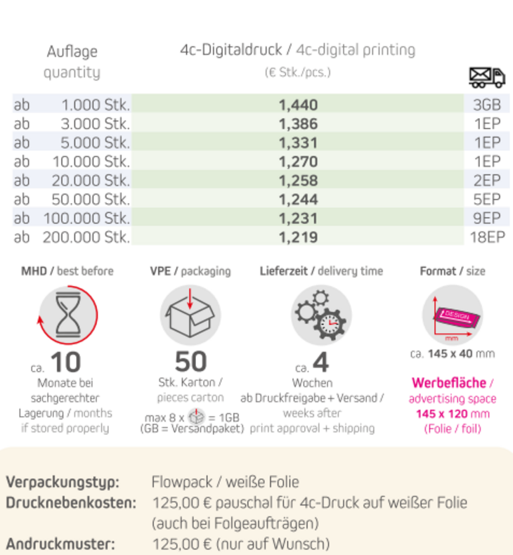 Verpackungstyp: Flowpack aus weißer FolieInhalt: Bio Müsliriegel Cranberry-Mandel 25gFormat: ca. 145 x 40 mmWerbefläche: 145 x 120 mmVPE: 50 Stk. / KartonHaltbarkeit: ca 10 Monate bei sachgerechter LagerungLieferzeit: ca. 4 Wochen ab Druckfreigabe + VersandMindestbestellmenge: 1000 Stück Inhalt:Zutaten Bio Knusperriegel Cranberry-Mandel: Erdnüsse* 21%*, Mandeln* 19%, Maltosesirup*, Rice crispies* 16% (Reismehl, Maismehl, Rohrzucker, Salz), Cranberries* 14% (Cranberries, Rohrzucker, Sonnenblumenöl), Rohrzucker*, Sultaninen*; * aus kontrolliert biologischem Anbau. Kann Spuren von Nüssen und Schalenfrüchten enthalten.