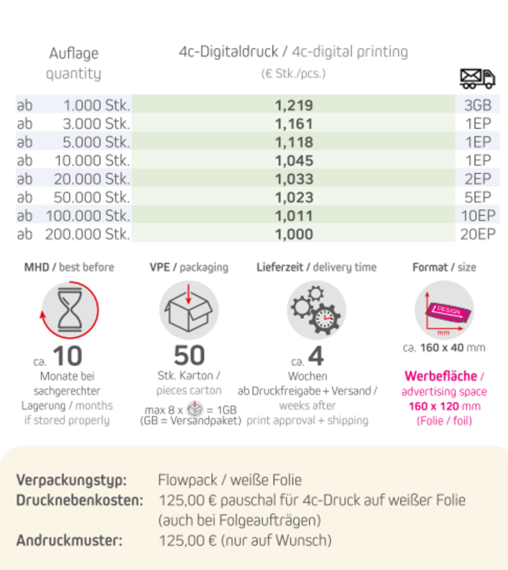Produkt: Flowpack / weiße FolieInhalt: Bio Müsliriegel Multikorn Aprikose 30gFormat: ca. 160 x 40 mmWerbefläche: 160 x 120 mmLieferzeit: ca. 4 Wochen ab Druckfreigabe + VersandVPE: 50 Stk. / KartonHaltbarkeit: ca. 10 Monate bei sachgerechter LagerungMindestbestellmenge: 1000 Stück Inhalt:Zutaten Bio Müsliriegel Multikorn-Aprikose: Maltosesirup*, Getreideflocken* (Hafer, Weizen), Aprikosen* 14 %, Äpfel*, extrudierter Weizen*, Pflanzenfett (Palm)*, Emulgator Sojalecithin.*aus kontrolliert biologischem Anbau. Enthält Gluten und Soja. Kann Haselnüsse enthalten.
