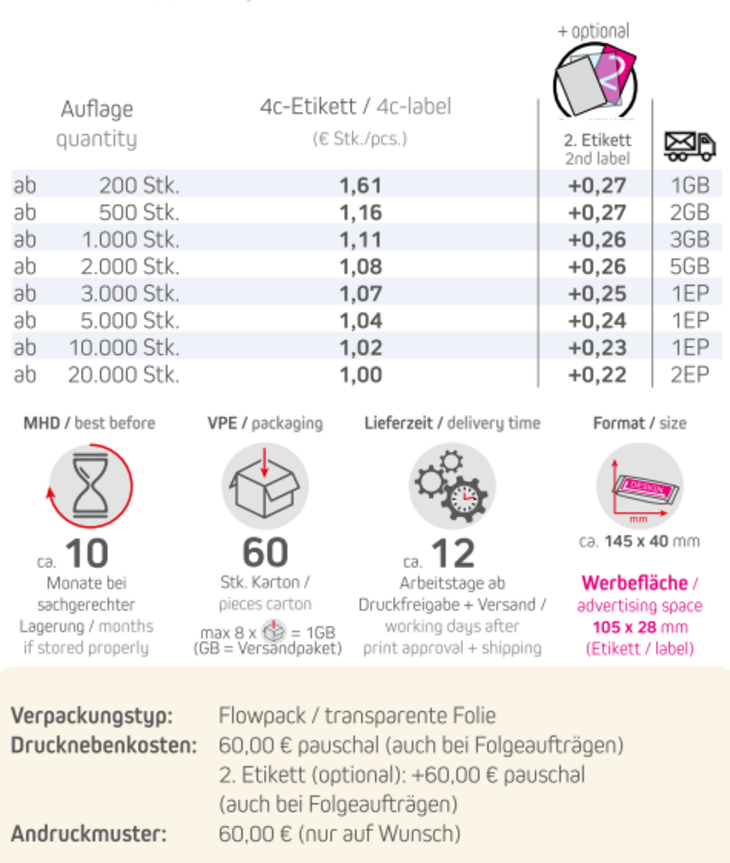 Verpackungstyp: Flowpack / transparente FolieInhalt: 25 g Müsliriegel Multikorn-ApfelFormat: ca. 145 x 40 mmDruckart: 4c-Etikett Werbefläche: B 105 x H 28 mmOptional: 2. Etikett möglich!Lieferzeit: ca. 12 Arbeitstage ab Druckfreigabe + VersandMindestmenge: 200 Stk.Haltbarkeit: ca. 10 Monate bei sachgerechter LagerungVerpackung: 60 Stück / Karton