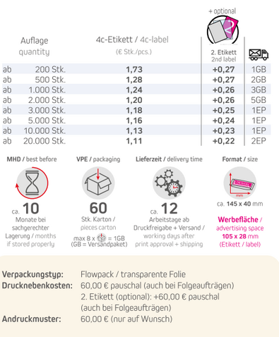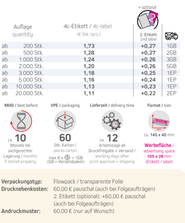 Produkt: Flowpack / transparente FolieInhalt: Müsliriegel Multikorn-Orange 30gFormat: ca. 145 x 40 mmDruck: 4c-EtikettWerbefläche: 105 x 28 mmOptional: 2. Etikett möglichLieferzeit: ca. 12 Arbeitstage ab Druckfreigabe + VersandVPE: 60 Stk. / KartonHaltbarkeit: ca. 10 Monate bei sachgerechter LagerungDruckart: DigitaldruckMindestbestellmenge: 200 Stück