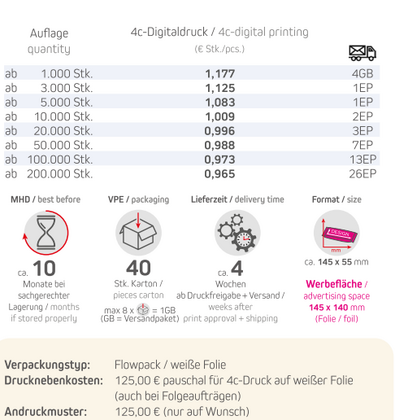 Produkt: Flowpack / weiße FolieInhalt: Müsliriegel Vanille-CranberryFormat: ca. 145 x 55 mmDruck: 4c EuroskalaWerbefläche: 145 x 140 mmLieferzeit: ca. 4 Wochen ab Druckfreigabe + VersandVPE: 40 Stk. / KartonHaltbarkeit: ca. 10 Monate bei sachgerechter LagerungMindestbestellmenge: 1000 StückInhalt:Zutaten Müsliriegel Vanille-Cranberry: Getreideprodukte 30% (Haferflocken, Maismehl, Reismehl), Glukosesirup, gesüßt getrocknete amerikanische Cranberry 10,7% (Cranberry, Rohrzucker, Sonnenblumenöl), pflanzliche Öle (Palmöl, Palmkernöl), Zucker, Molkepulver (Milch), Feuchthaltemittel, Säureregulator: Zitronensäure; Gefriergetrocknete Himbeere 0,27%, Emulgator: Lecithin: (von Soja); Salz, natürliches Aroma, Gerstenmalzextrakt, Meersalz, natürlicher Vanillegeschmack. Kann Spuren von Erdnüssen, anderen Nüssen und Sesam enthalten.