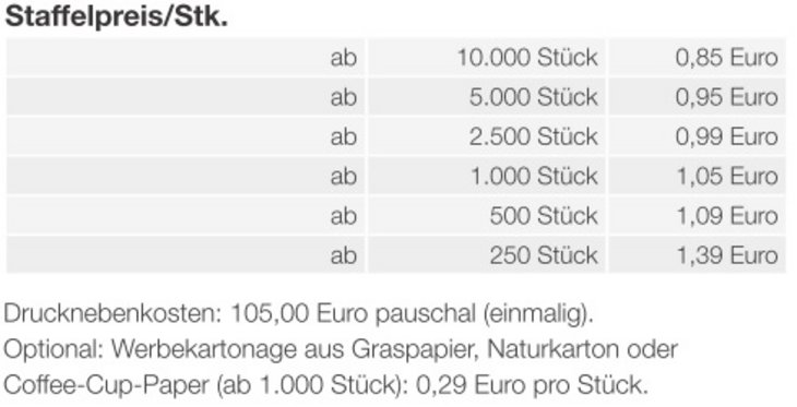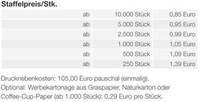Klein, süß, lecker! Der Kleine mit der großen Werbewirkung. Die süßen kleinen Muffins in den Geschmacksrichtungen Schokosplitter, Schokolade und Tradition versprechen himmlische Genussmomente.Produktdetails: Mini Muffin in einer individuell bedruckbaren Werbekartonage.Format: ca. 47 x 47 x 47 mm.Nachhaltigkeit: Klimaneutrales Produkt, gefertigt auf FSC®-zertifiziertem Karton aus nachhaltiger Forstwirtschaft.Bedruckung/Motive: High-End Digitaldruck bzw. Offsetdruck, 4-farbig, ganz individuell nach Ihren Vorlagen. Bitte fordern Sie die Maße der Werbefläche als Standzeichnung an.Inhalt: 1 Mini Muffin (ca. 14g) in Aroma-Schutzverpackung. Geschmacksrichtungen: Schokosplitter, Schokolade und Tradition“ gemischt.Haltbarkeit: 5 Wochen.Lieferzeit: ca. 15 Arbeitstage nach DruckfreigabeMindestbestellmenge: 250 Stück