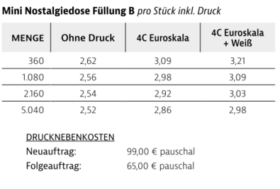 Weißblechdose mit Federstahldeckel in Blank mit verschiedenen Füllvarianten.Inhalt: 50gFüllvarianten: Füllung A: PfefferminzFüllung B: Traubenzucker, Skittles oder VivilHaltbarkeit: ca. 9 Monate bei sachgerechter Lagerung: Brauseherzen ca. 12 Monate bei sachgerechter Lagerung: Traubenzucker, Pfefferminz, Skittles; ca. 18 Monate bei sachgerechter Lagerung: VIVILVerpackungsmaß: ø 75 mm, Höhe ca. 22 mmDruckart: ohne Druck oder 4c Euroskala oder 4c Euroskala + weißVerpackungseinheit: 24 St. im Displaykarton / 120 St. im KartonLieferzeit: ca. 10-15 Arbeitstage nach DruckfreigabeMindestbestellmenge: 360 Stück