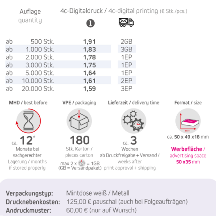 Inhalt: Pfefferminz Drops zuckerfrei 20gVerpackung: Mintdose weiß / MetallFormat: Mintdose: ca. 59 x 49 x 18 mmDruck: 4c-DigitaldruckWerbefläche: Mintdose: 50 x 35 mmLieferzeit: ca. 3 Wochen ab Druckfreigabe + VersandVPE: Mintdose: 180 Stk. / KartonHaltbarkeit: ca. 12 Monate bei sachgerechter LagerungMindestbestellmenge: 500 Stück