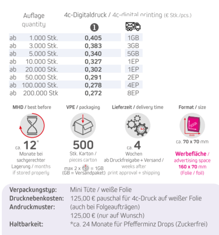 Preisliste Pfefferminz Drops 5g zuckerfrei in Mini Tüte mit Logo Details