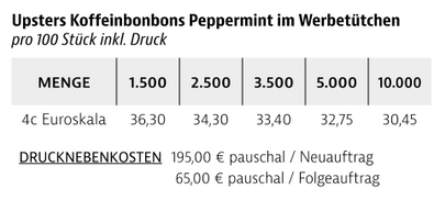 Preisliste Upsters Koffeinbonbon Peppermint mit Logo Details